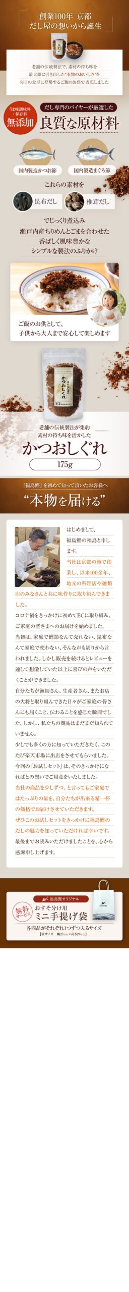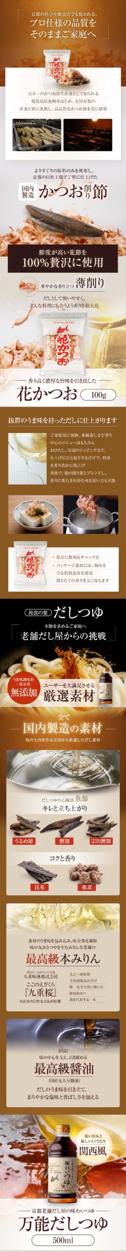 京都のかつお節やだしの卸売総合メーカー福島鰹株式会社様より、前回のAmazon用スライド画像制作に続きご依頼をいただきました。MakeShop・楽天などのモールに掲載する商品ページLP(定期セット)の制作で、企画段階から参加させて頂きました。